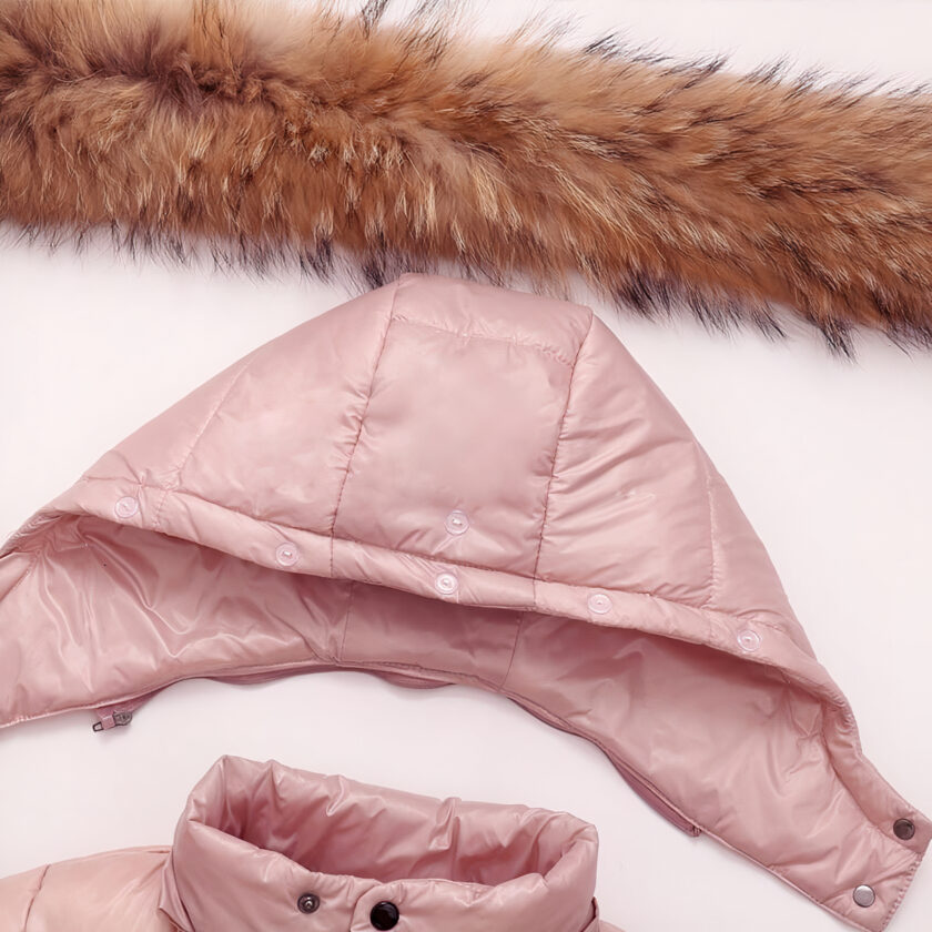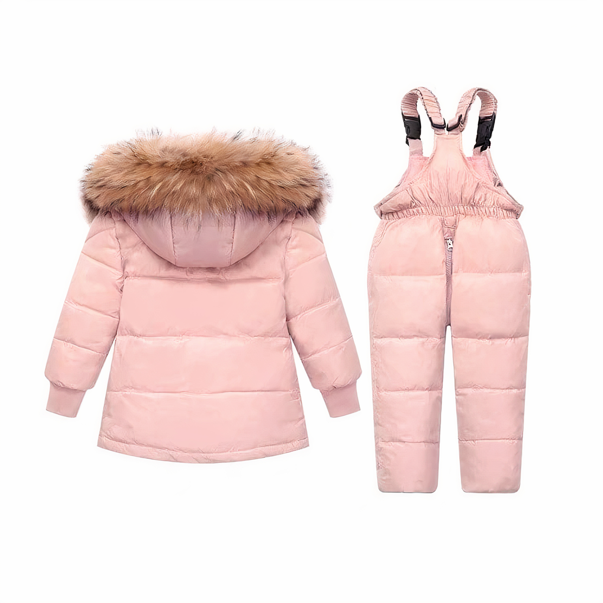 Deze donsjackset voor baby\’s bestaat uit een donsjack met capuchon en een bijpassende jumpsuit. Het jack heeft geribde boorden en een afneembare capuchon, terwijl de bijpassende broek is voorzien van een elastische tailleband en warme gewatteerde pijpen.