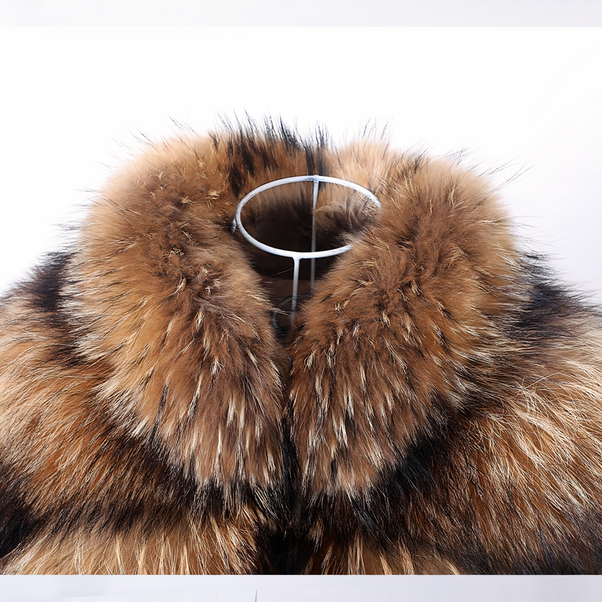 Dit donsjack van imitatiebont voor dames is perfect voor diegenen die een vleugje wildheid aan hun garderobe willen toevoegen. Het dikke, luxueuze ontwerp zorgt voor een gedurfde, chique look.