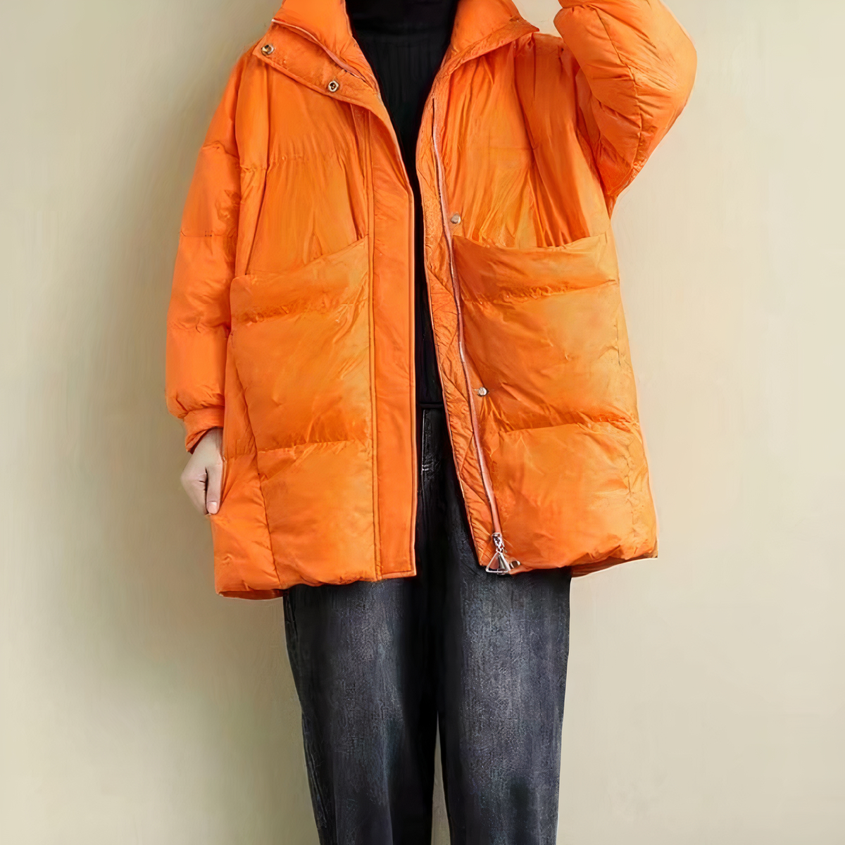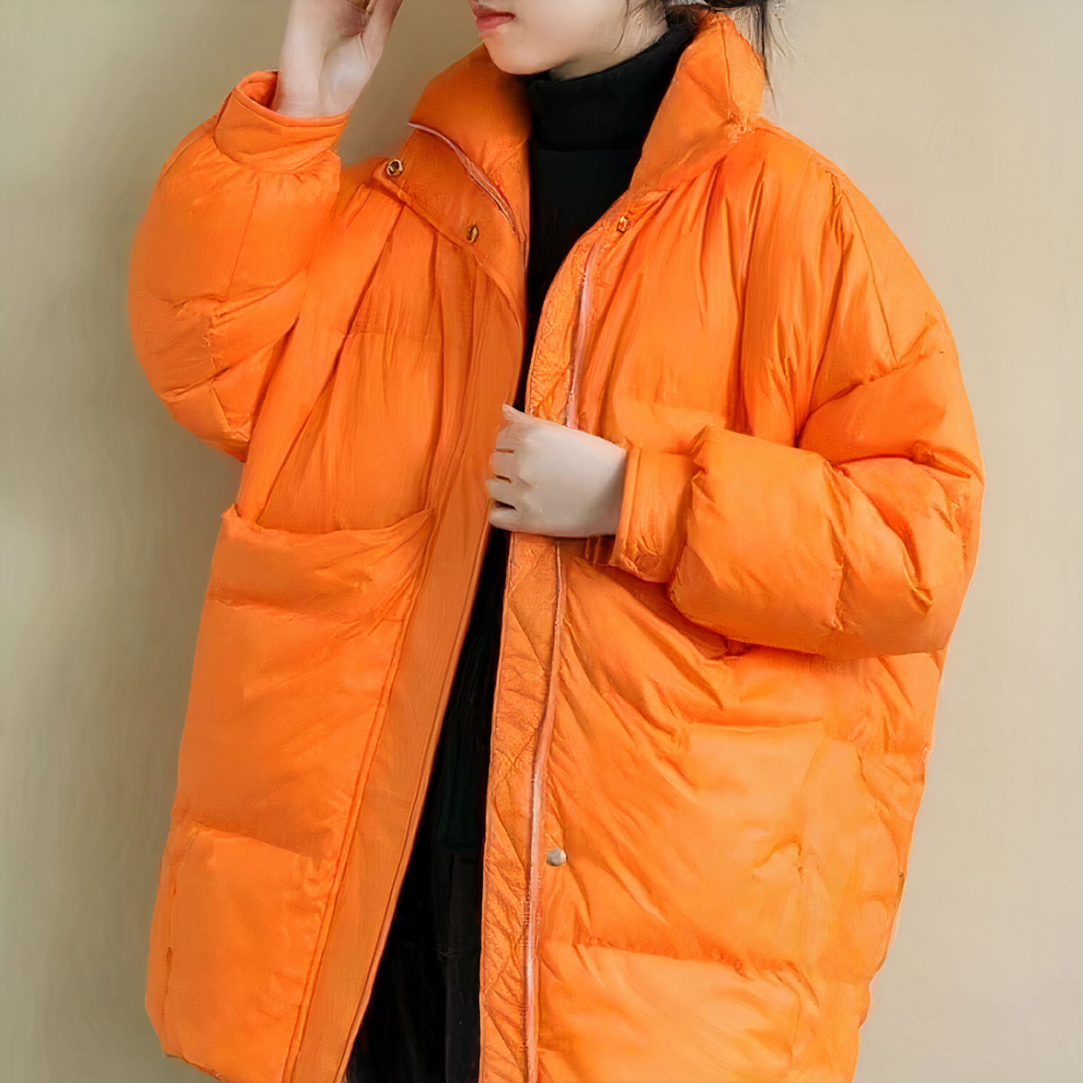 Deze oversized donsjas is ideaal om de winter in stijl aan te pakken! De losse pasvorm van deze oranje donsjas houdt u comfortabel, maar toch stijlvol en on-trend. De hoge kraag, lange mouwen en knoopsluiting aan de voorkant geven u al het comfort dat u nodig hebt om zelfs het koudste weer met vertrouwen tegemoet te treden. De zakken houden uw spullen altijd op orde en uw handen warm.