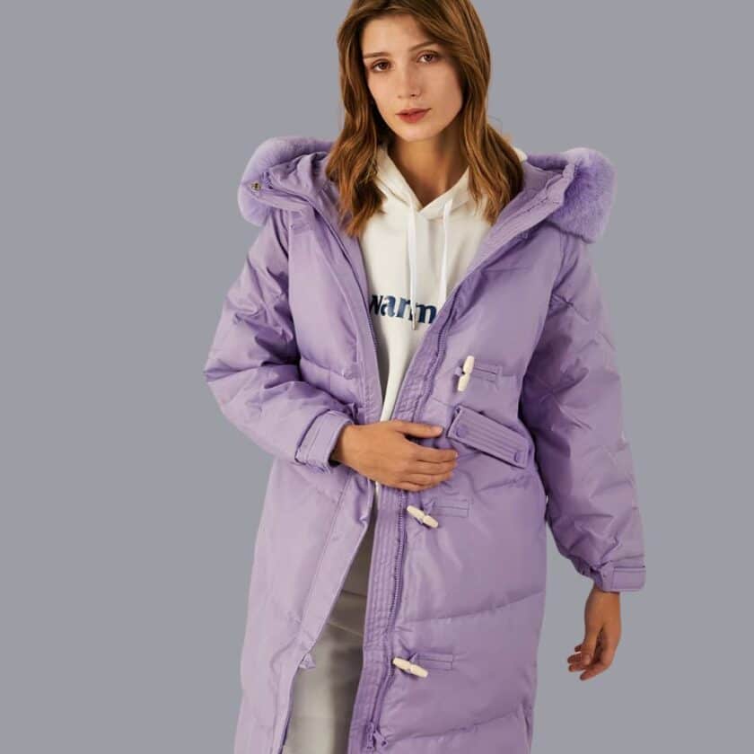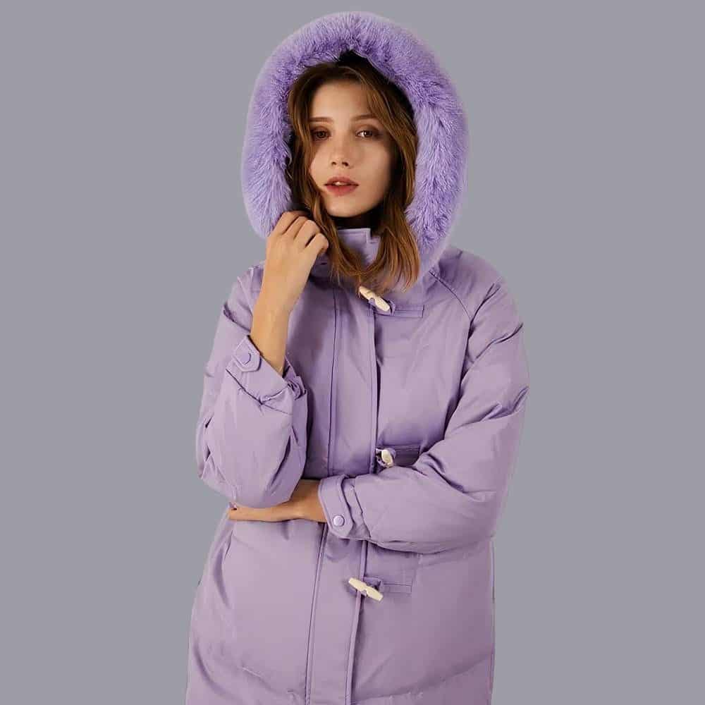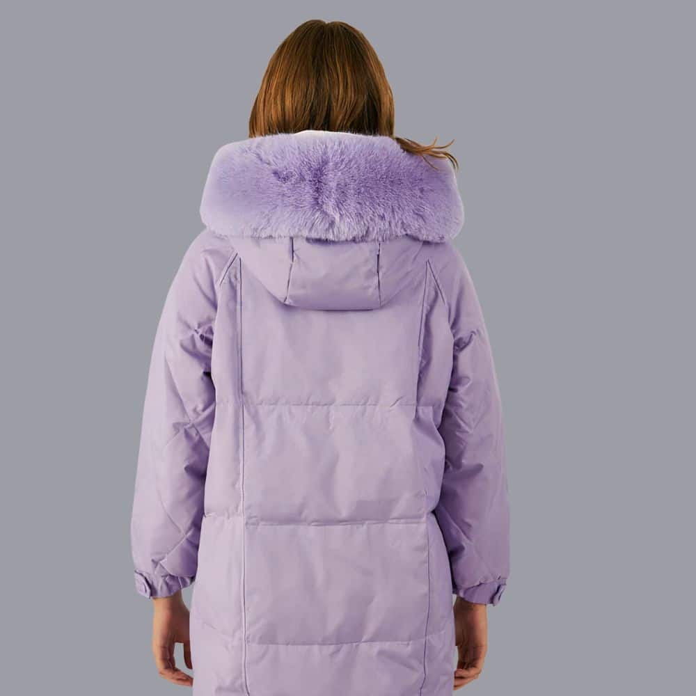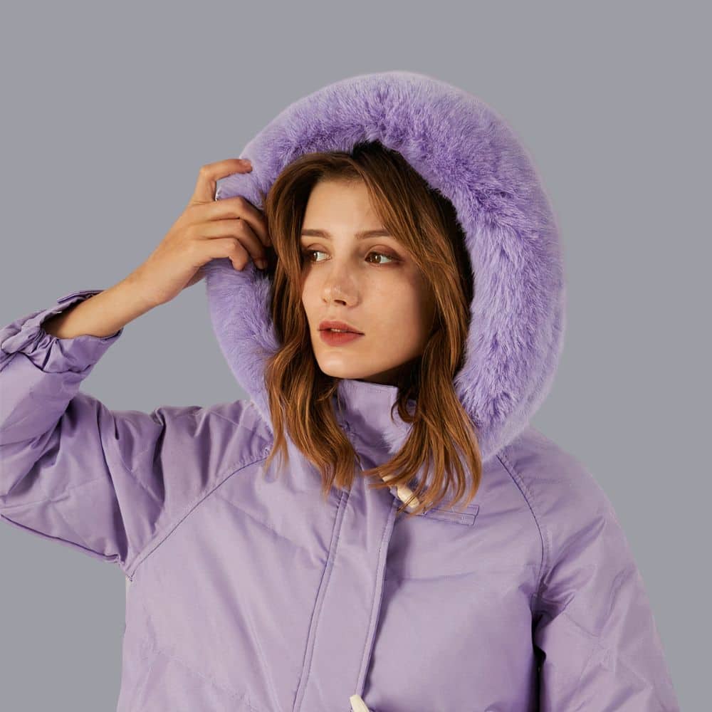 Deze luxe jas is ontworpen voor elegante vrouwen. Hij is gemaakt van hoogwaardige waterdichte stof en voelt zacht aan. Het paarse bont past perfect bij de stof van de jas en geeft een chique, verfijnde uitstraling. De donsjas heeft een getailleerd silhouet dat uw lichaam op een flatterende manier benadrukt. Deze jas is perfect voor koude winters, omdat hij u warm houdt en u tegelijkertijd een chique uitstraling geeft.