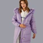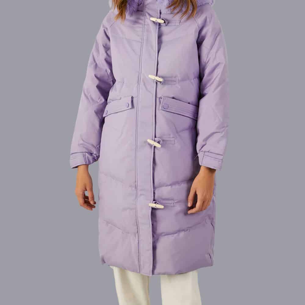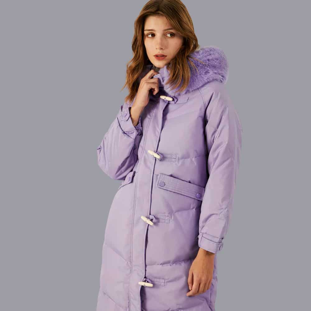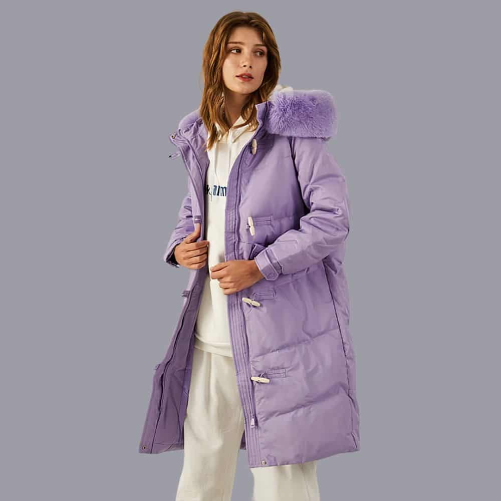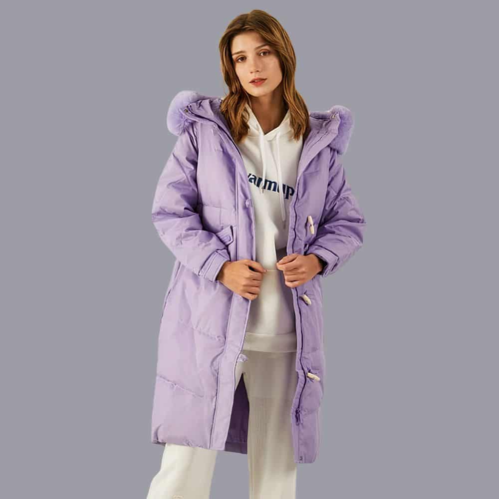 Deze luxe jas is ontworpen voor elegante vrouwen. Hij is gemaakt van hoogwaardige waterdichte stof en voelt zacht aan. Het paarse bont past perfect bij de stof van de jas en geeft een chique, verfijnde uitstraling. De donsjas heeft een getailleerd silhouet dat uw lichaam op een flatterende manier benadrukt. Deze jas is perfect voor koude winters, omdat hij u warm houdt en u tegelijkertijd een chique uitstraling geeft.