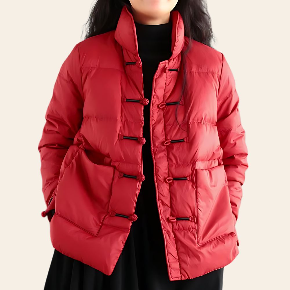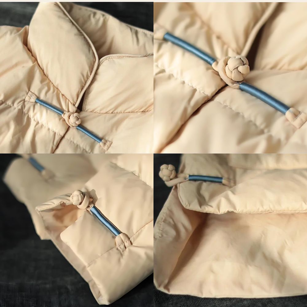 Deze korte donsjas is geïnspireerd op de traditionele stijl van Shanghai en combineert elegantie en warmte om u door alle seizoenen heen te leiden. De subtiel bewerkte kikkersluitingen voegen een vleugje originaliteit toe dat niet onopgemerkt zal blijven. Hij is verkrijgbaar in verschillende verfijnde kleuren en kan in de stad of tijdens een wandeling op het platteland worden gedragen. Laat u verleiden door het subtiele huwelijk van authenticiteit en modern comfort.