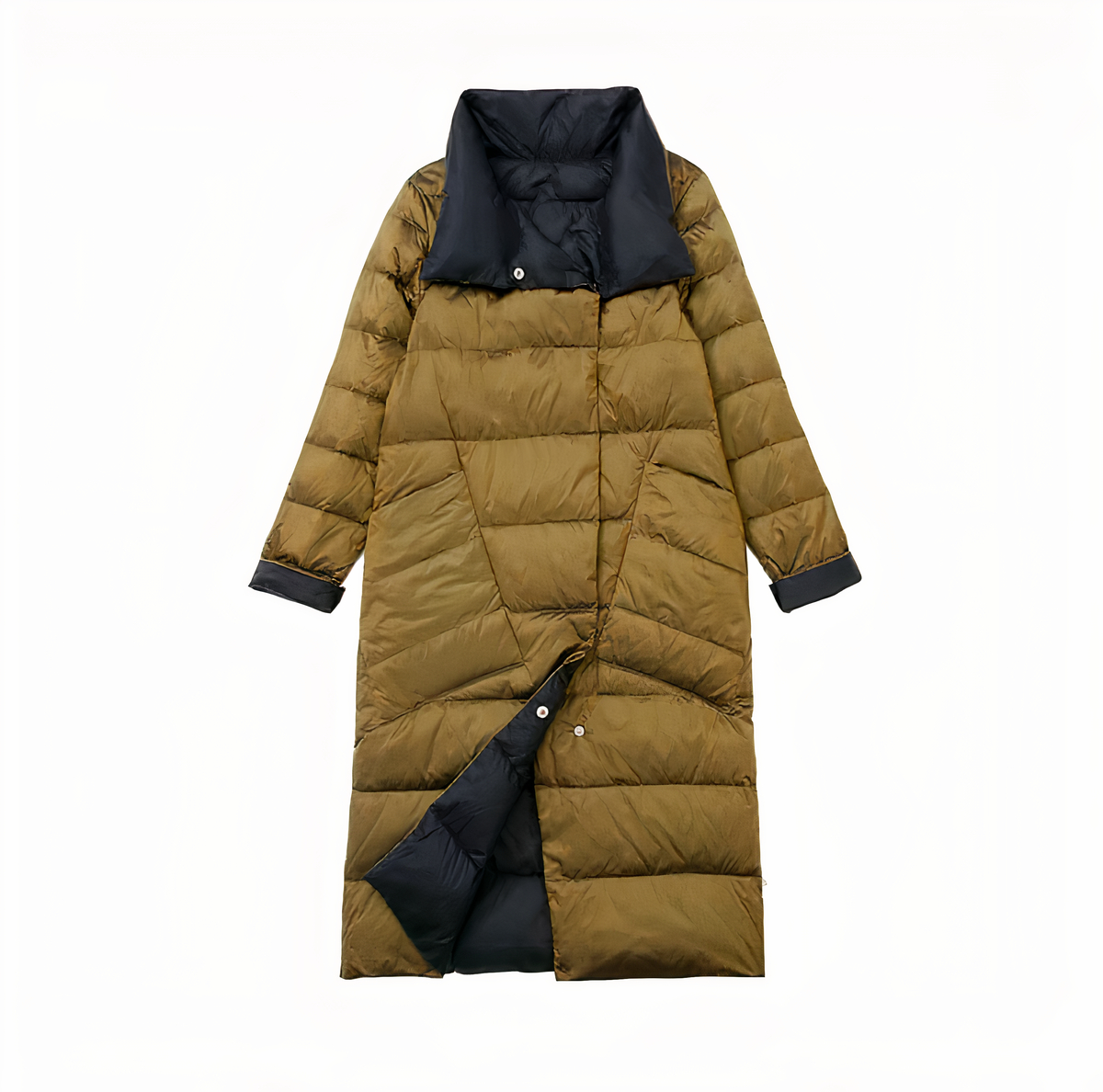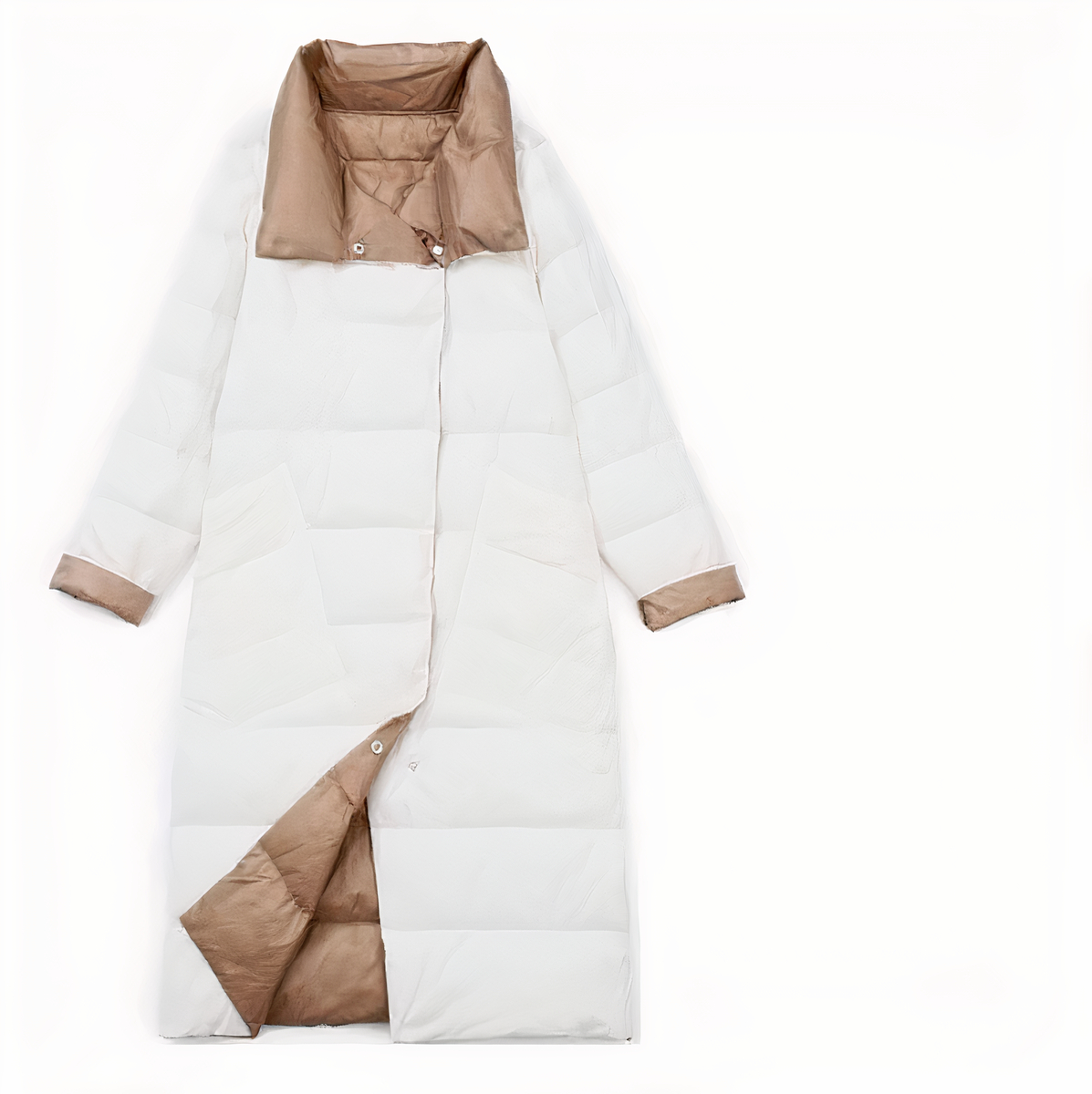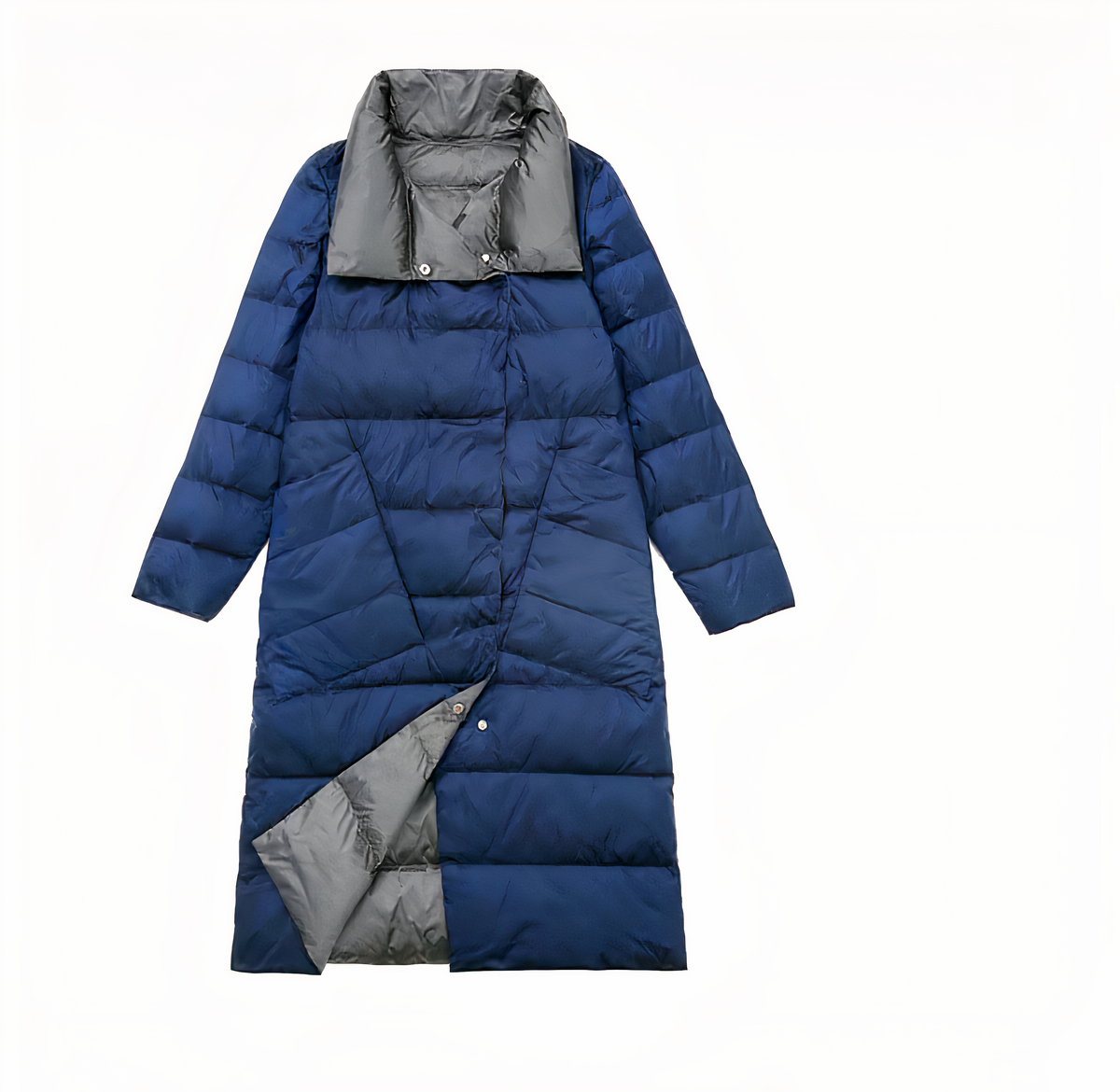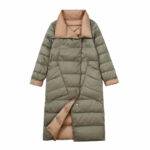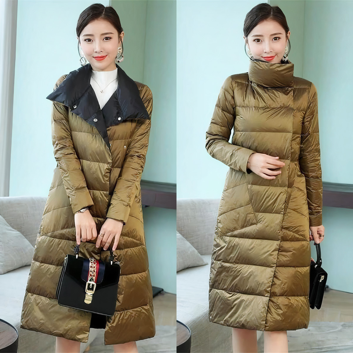 Deze lange, lichtgewicht donsjas is uiterst comfortabel om te dragen. Hij is getailleerd bij de buste om uw silhouet te verbeteren, en dankzij de twee omkeerbare zijkanten kunt u de look van uw outfit veranderen wanneer u maar wilt! Hij is verkrijgbaar in verschillende kleuren, is ideaal voor koelere dagen en kan bij vrijwel elke outfit gedragen worden.