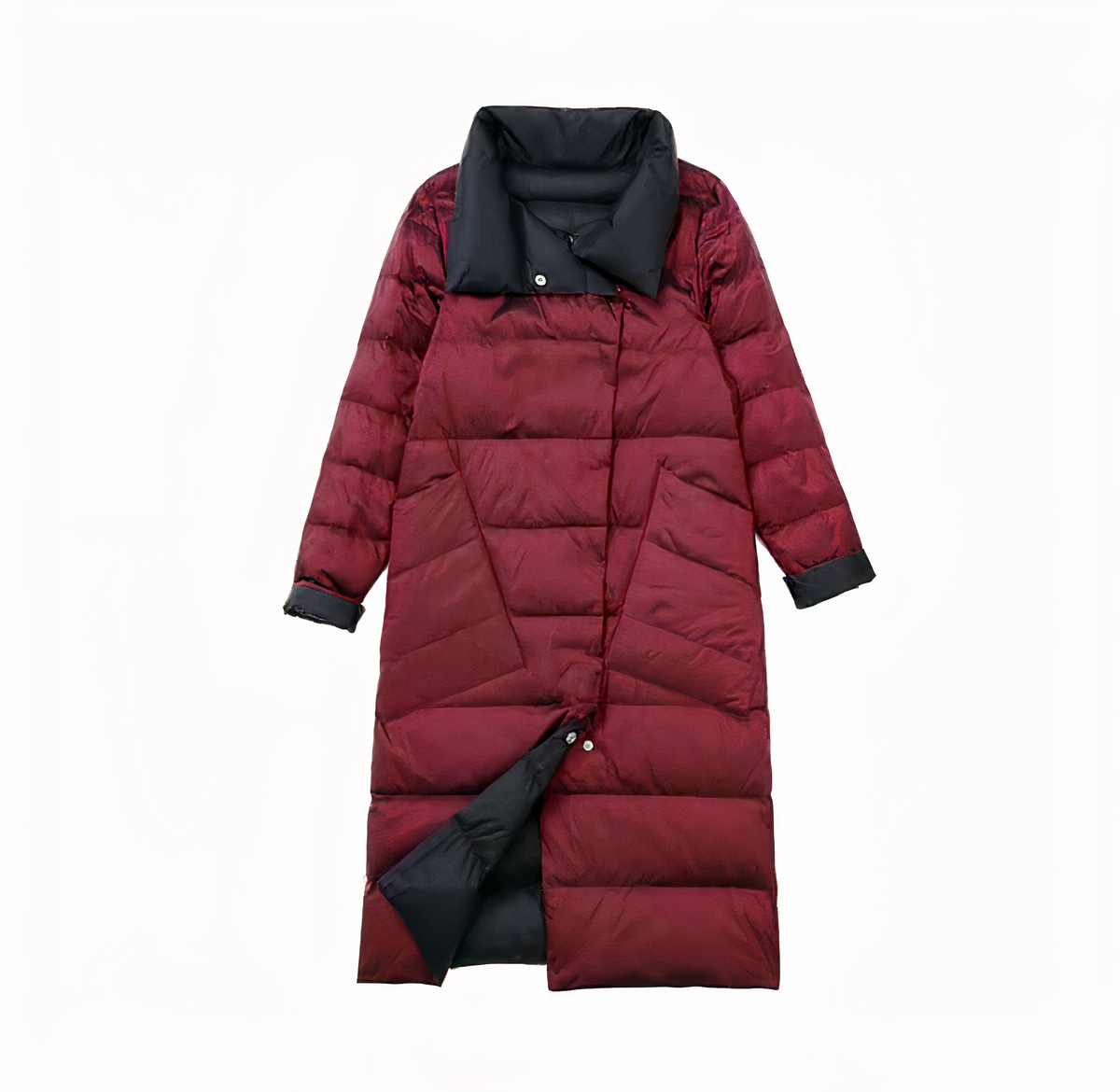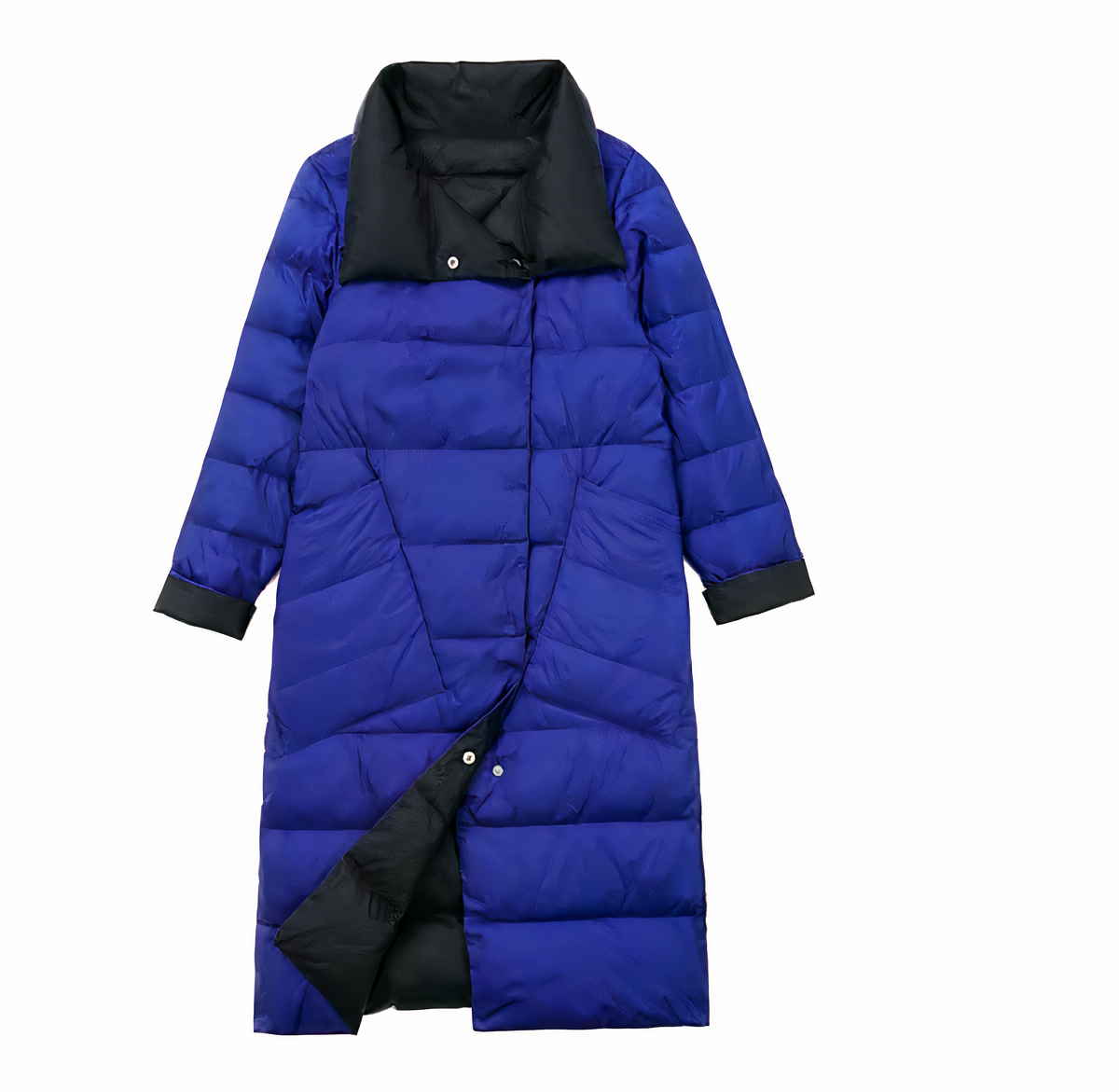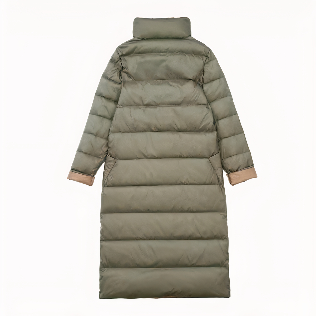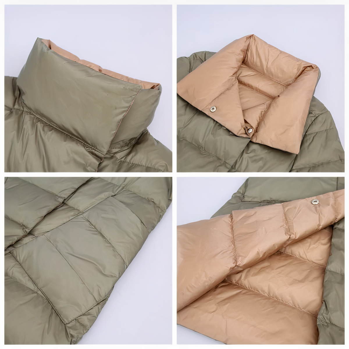 Deze lange, lichtgewicht donsjas is uiterst comfortabel om te dragen. Hij is getailleerd bij de buste om uw silhouet te verbeteren, en dankzij de twee omkeerbare zijkanten kunt u de look van uw outfit veranderen wanneer u maar wilt! Hij is verkrijgbaar in verschillende kleuren, is ideaal voor koelere dagen en kan bij vrijwel elke outfit gedragen worden.