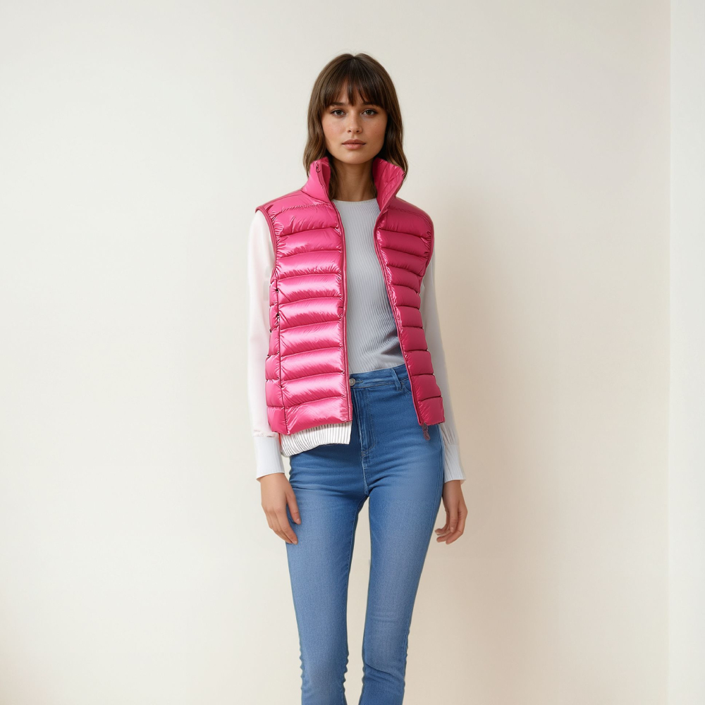 Ons lichtgewicht donsjack zonder mouwen voor dames is een zeer comfortabel en warm kledingstuk, ideaal voor herfst- of lentedagen. Het is gemaakt van een zachte, dikke stof die u warm houdt terwijl het licht en comfortabel is om te dragen.