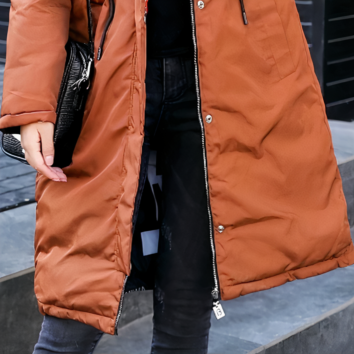 Dit chique donsjack in urban stijl is gemaakt van stretchstof en is volledig gevoerd voor maximale warmte. Het heeft een afneembare, met bont gevoerde capuchon, elastische manchetten en een centrale ritssluiting.