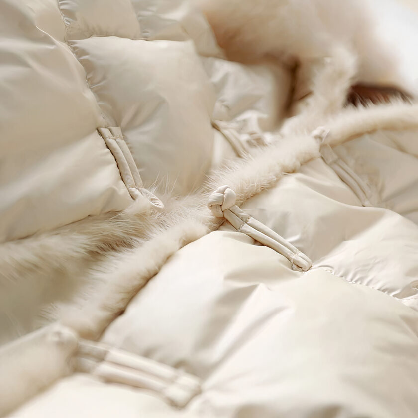 Dit is de perfecte donsjas om de winter mee door te komen! Hij is gemaakt van beige stof en heeft een gevoerde binnenkant, zodat u warm en stijlvol tegelijk kunt blijven. De hoge kraag beschermt u tegen kou en slecht weer, terwijl de zijzakken handig zijn om uw spullen in op te bergen. Deze donsjas heeft een knoopsluiting, dus u kunt hem gemakkelijk aantrekken. Draag hem met een zwarte skinny broek en hoge laarzen voor een chique, elegante look, of met jeans en sneakers voor een meer casual stijl.