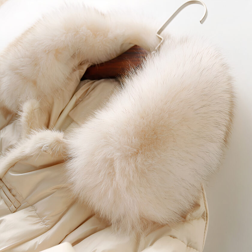 Dit mooie donsjack heeft een bontkraag, een knoopsluiting, twee steekzakken, een slanke pasvorm en elastische manchetten voor extra comfort, dus het is ideaal voor het winterweer. Het houdt u niet alleen warm, maar is ook erg stijlvol en chique met zijn bont, dus u ziet er stijlvol uit als u de stad in gaat.