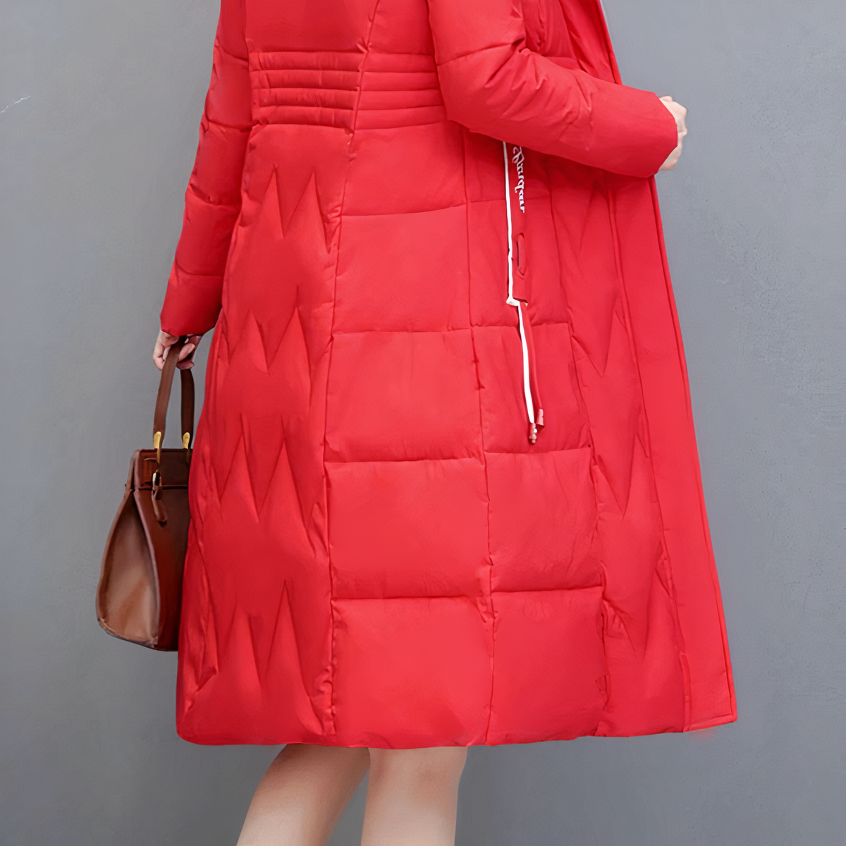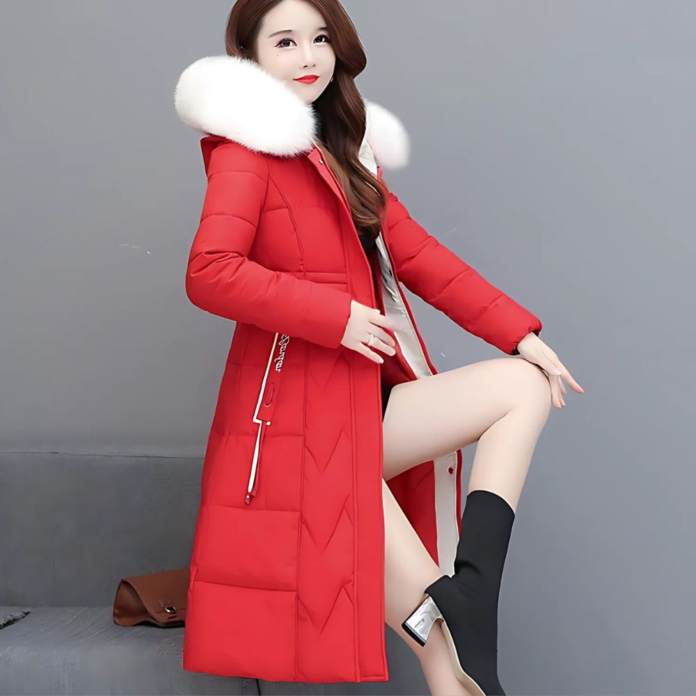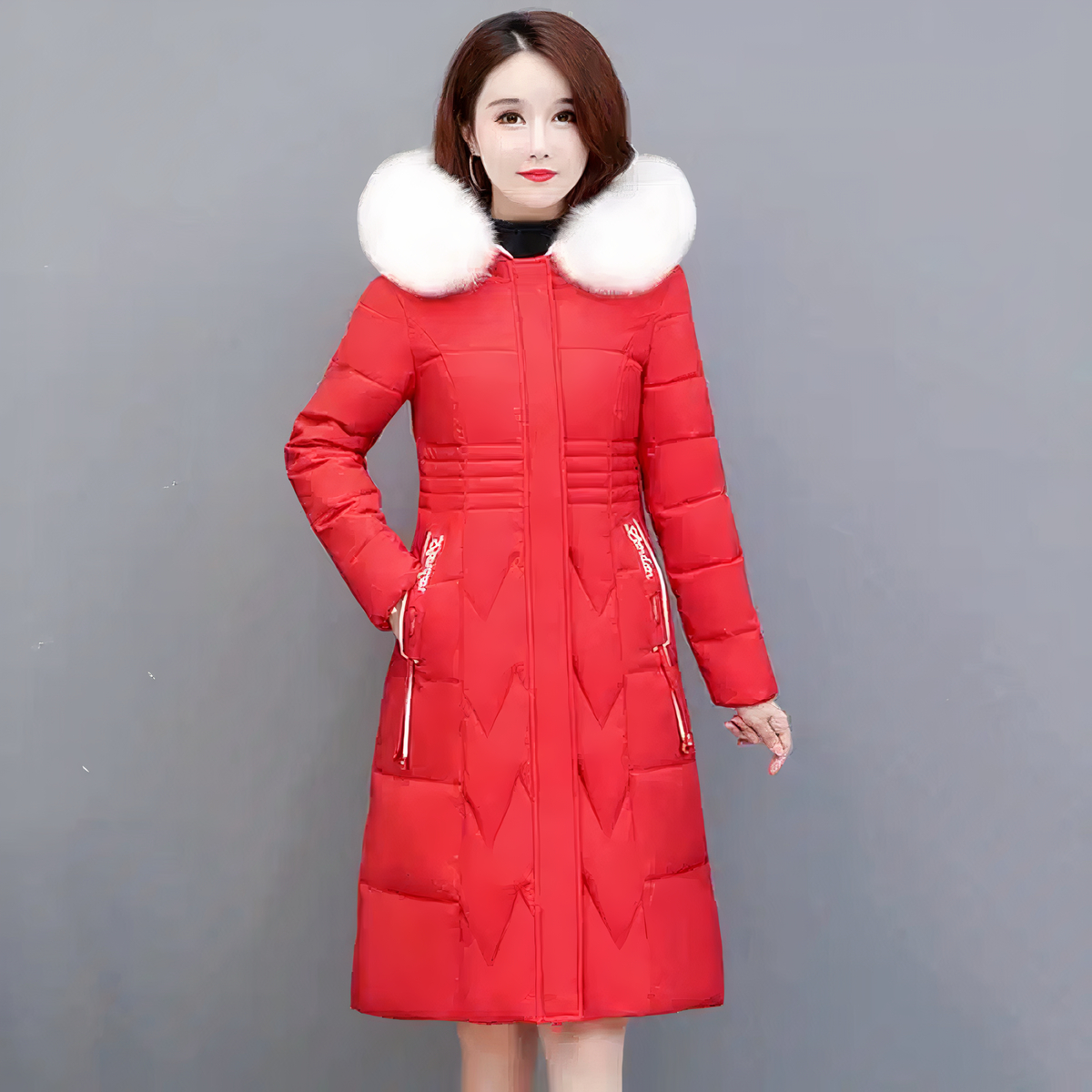 Onze lange rode donsjas is de perfecte metgezel voor al uw winteravonturen. Hij heeft een met synthetisch bont gevoerde capuchon voor stijl en comfort. Het lange silhouet beschermt u tegen de kou, terwijl de slanke pasvorm u er stijlvol uit laat zien. De zachte, lichtgewicht gewatteerde stof biedt uitstekende thermische isolatie en is tegelijkertijd ademend, perfect voor buitenactiviteiten.