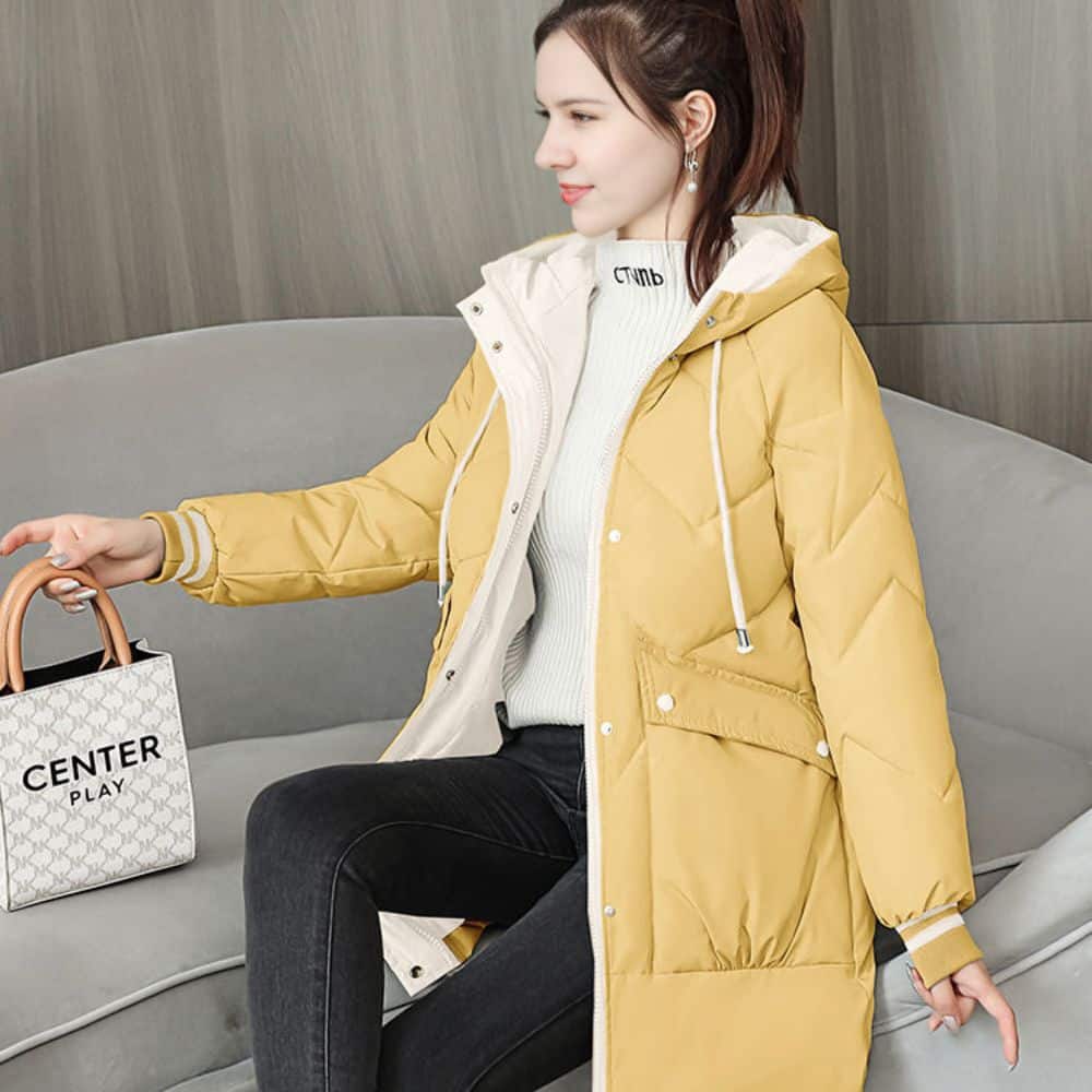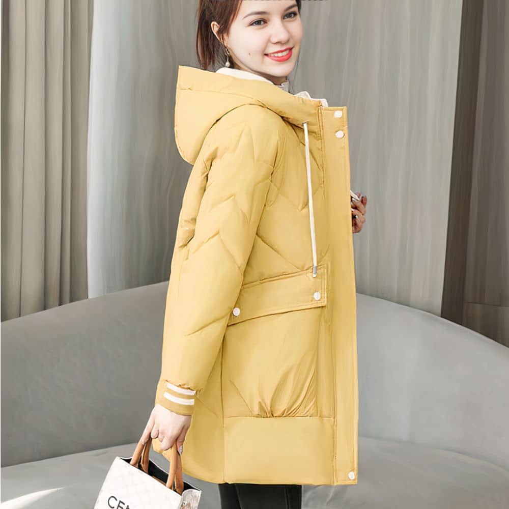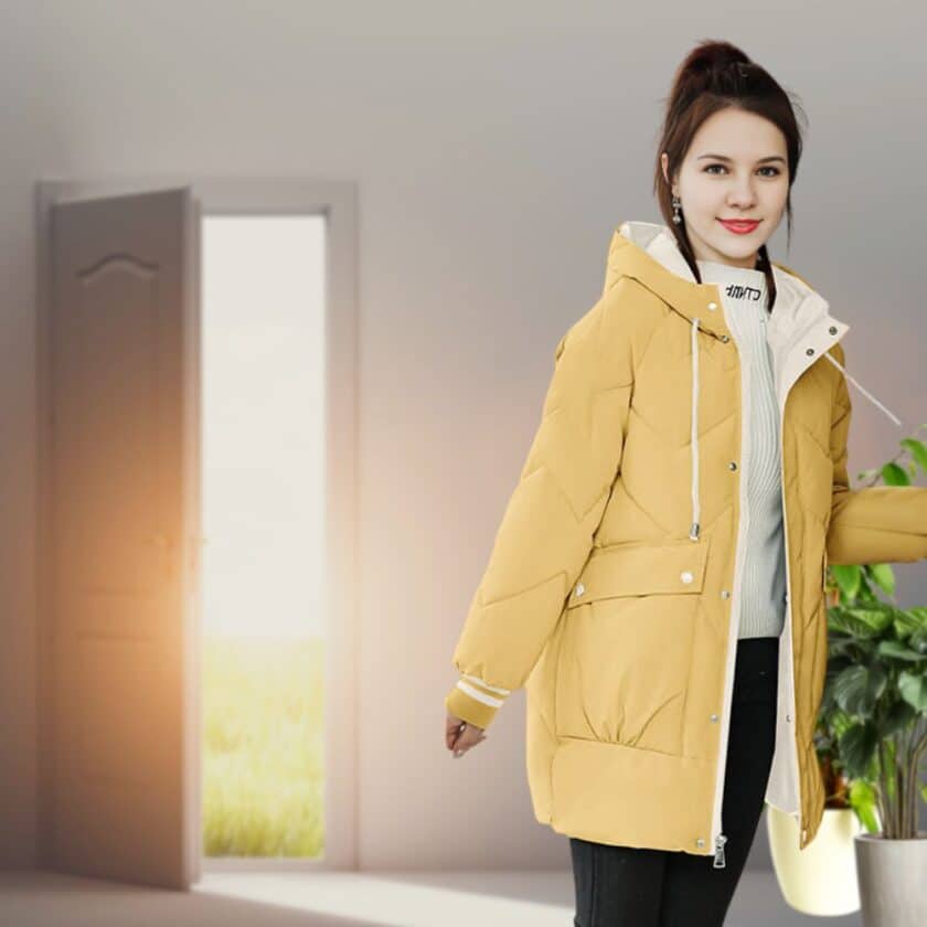 Dit gele donsjack met capuchon voor dames heeft een trendy ontwerp en is gemaakt van een zachte, dikke stof, waardoor het perfect is voor frisse dagen van de herfst tot de lente. De nette afwerking bestaat uit bijpassende knopen en een centrale ritssluiting.