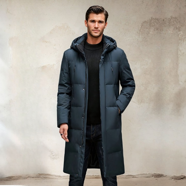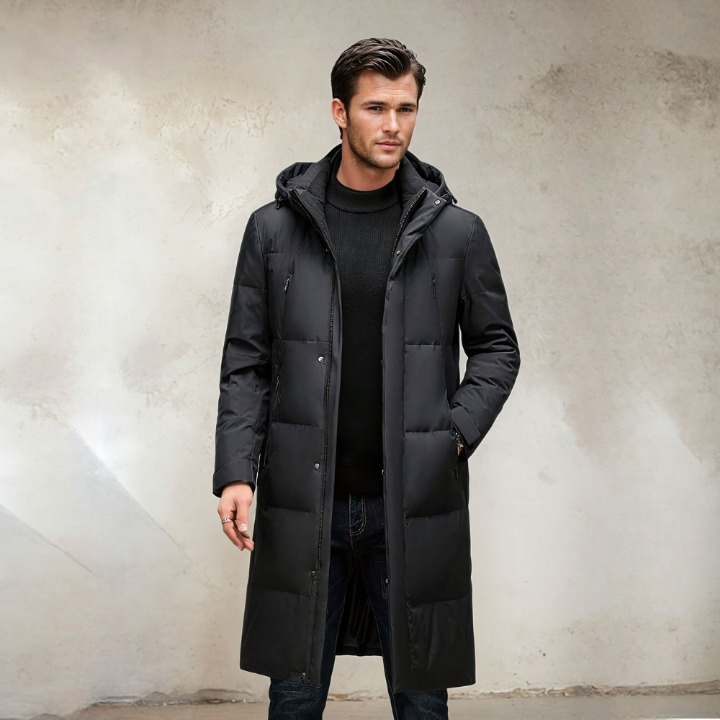 Deze mooie donsjas voor heren is zacht en warm, perfect voor die koude winterdagen. De capuchon voegt een vleugje luxe toe en de lange stijl houdt u warm van de nek tot de knieën.