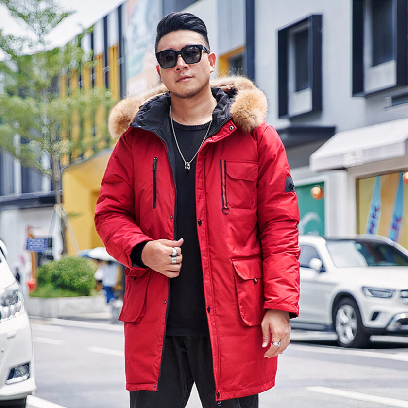 Deze halflange donsjas met capuchon en bont voor heren is verkrijgbaar in twee klassieke kleuren: zwart en rood. Of u nu kiest voor de soberheid van zwart of de gedurfdheid van rood, deze jas heeft bruin imitatiebont rond de capuchon, wat een opvallend vleugje stijl en extra warmte toevoegt. De combinatie van kleuren en materialen geeft deze donsjas een stijlvolle en veelzijdige look, ideaal om op te vallen en toch comfortabel te blijven op koude winterdagen.