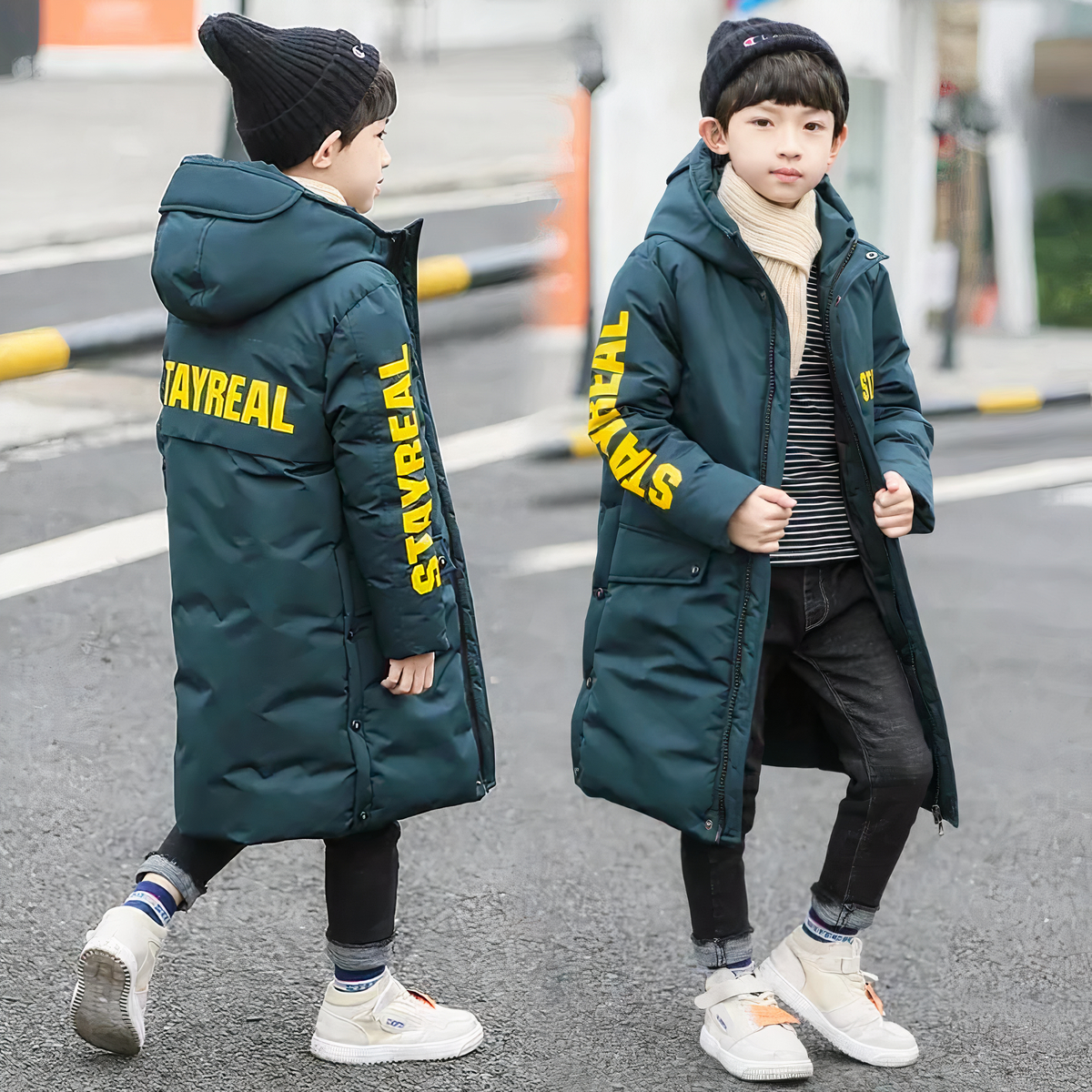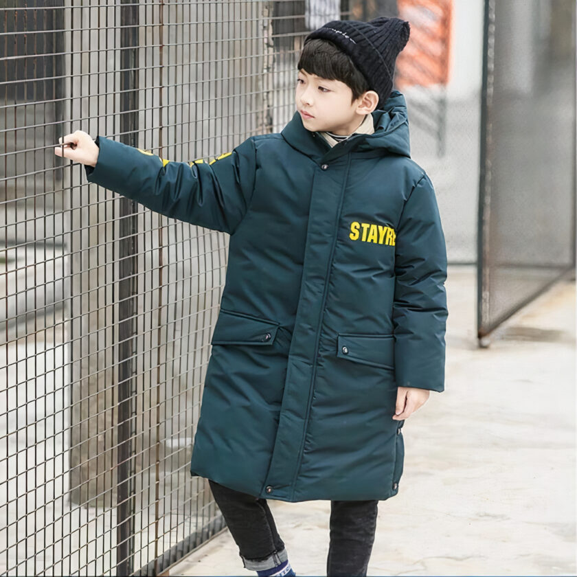 Deze lange donsjas voor jongens met capuchon is een zeer comfortabele en warme jas, perfect voor die lange koude winterdagen. Hij heeft een brede, met bont gevoerde capuchon om het hoofd en de nek warm te houden, en een volledige sluiting aan de voorkant. De mouwen hebben ook verstelbare manchetten aan beide uiteinden voor een betere pasvorm.