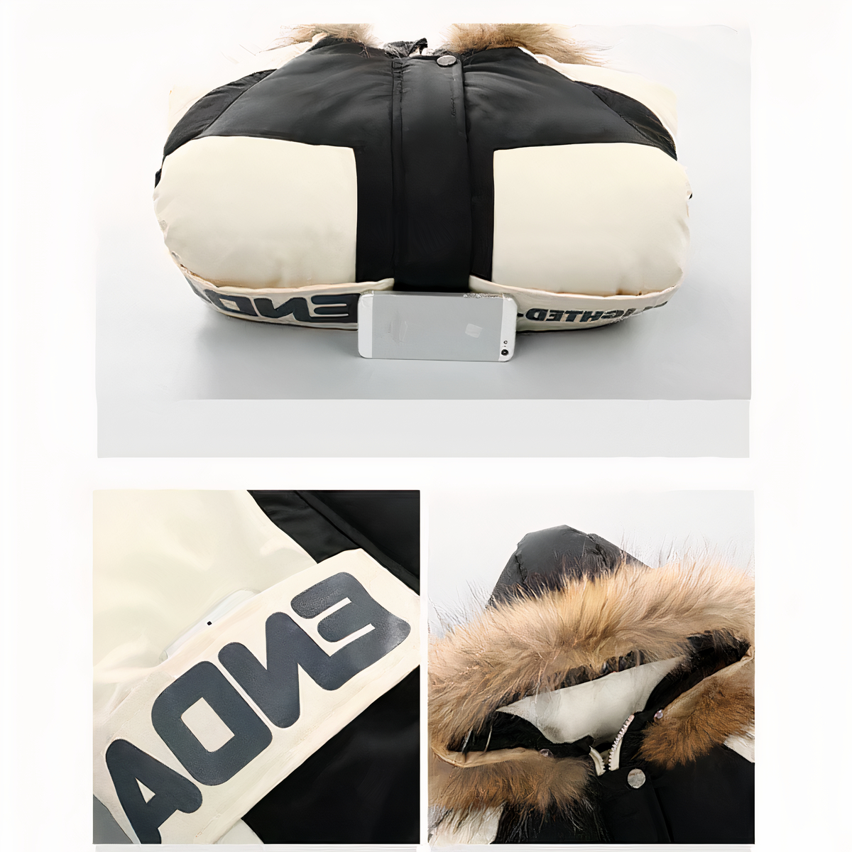 Hier is een warm donsjack van dik katoen dat perfect is om het winterweer mee te trotseren! De dikke katoenen stof voelt aangenaam en zacht aan, maar is toch erg warm. Het heeft twee zakken aan de voorkant, perfect om uw handen of kleine spullen in te steken. De capuchon is afneembaar, dus u kunt hem aan uw behoeften aanpassen.
