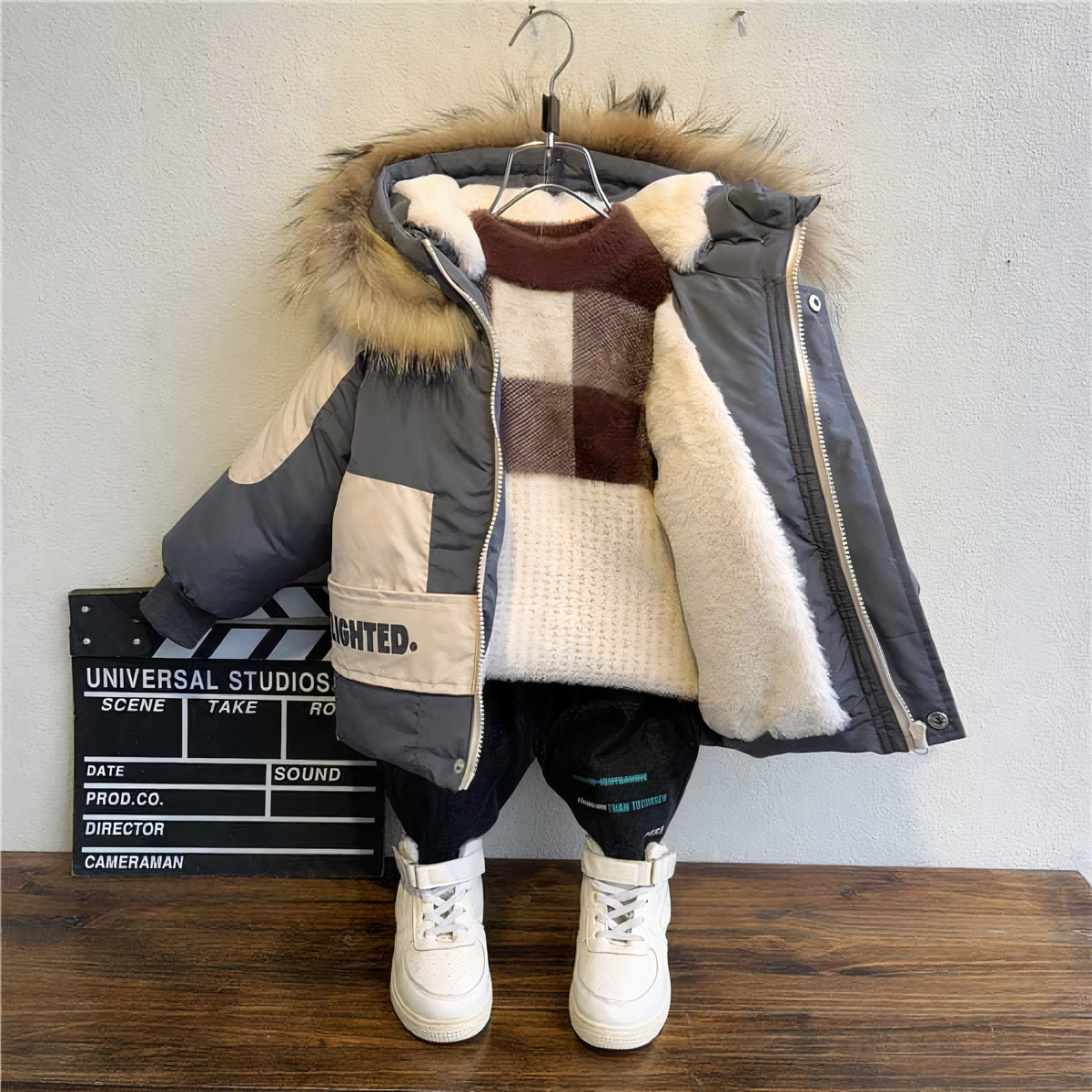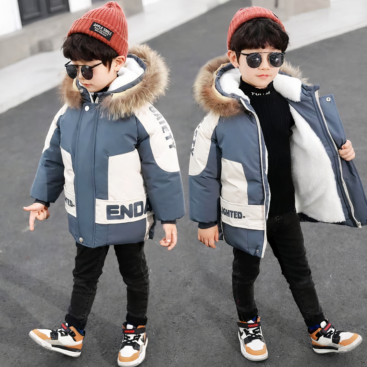 Deze warme, dikke katoenen donsjas is perfect voor de winter! Hij is gemaakt van dikke, slijtvaste stof, dus hij is warm en behaaglijk. De met synthetisch bont gevoerde capuchon biedt extra bescherming tegen de kou, terwijl de zakken praktische opbergruimte bieden voor kleine spullen. Deze donsjas is verkrijgbaar voor kinderen van 2 tot 7 jaar, dus u kunt de jas kiezen die bij u past.