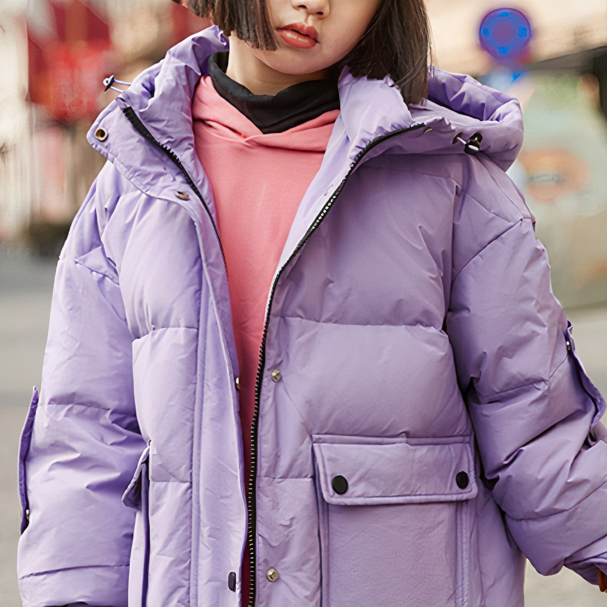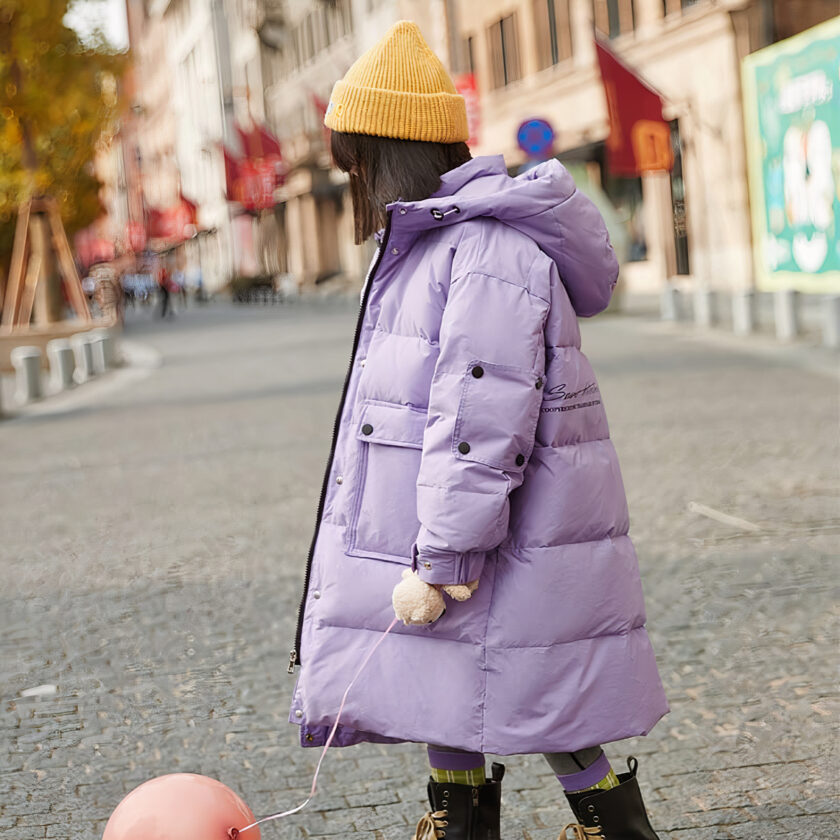 Deze lange paarse donsjas voor kinderen zal onmisbaar worden in de garderobe van uw kleine meid. Hij is ideaal als buitenjas dankzij de slijtvaste waterdichte stof. Deze lange donsjas voor kinderen met capuchon voelt zacht aan en is comfortabel om te dragen.