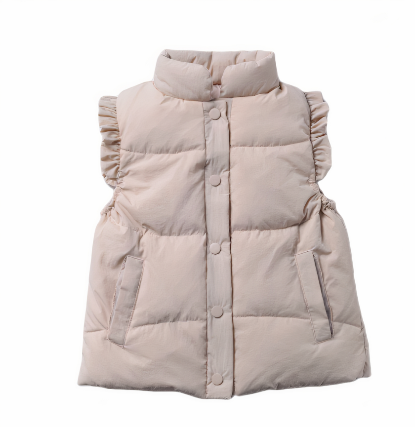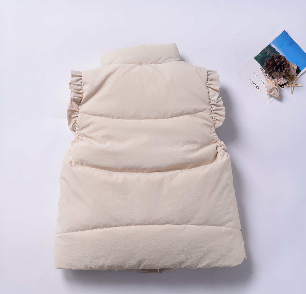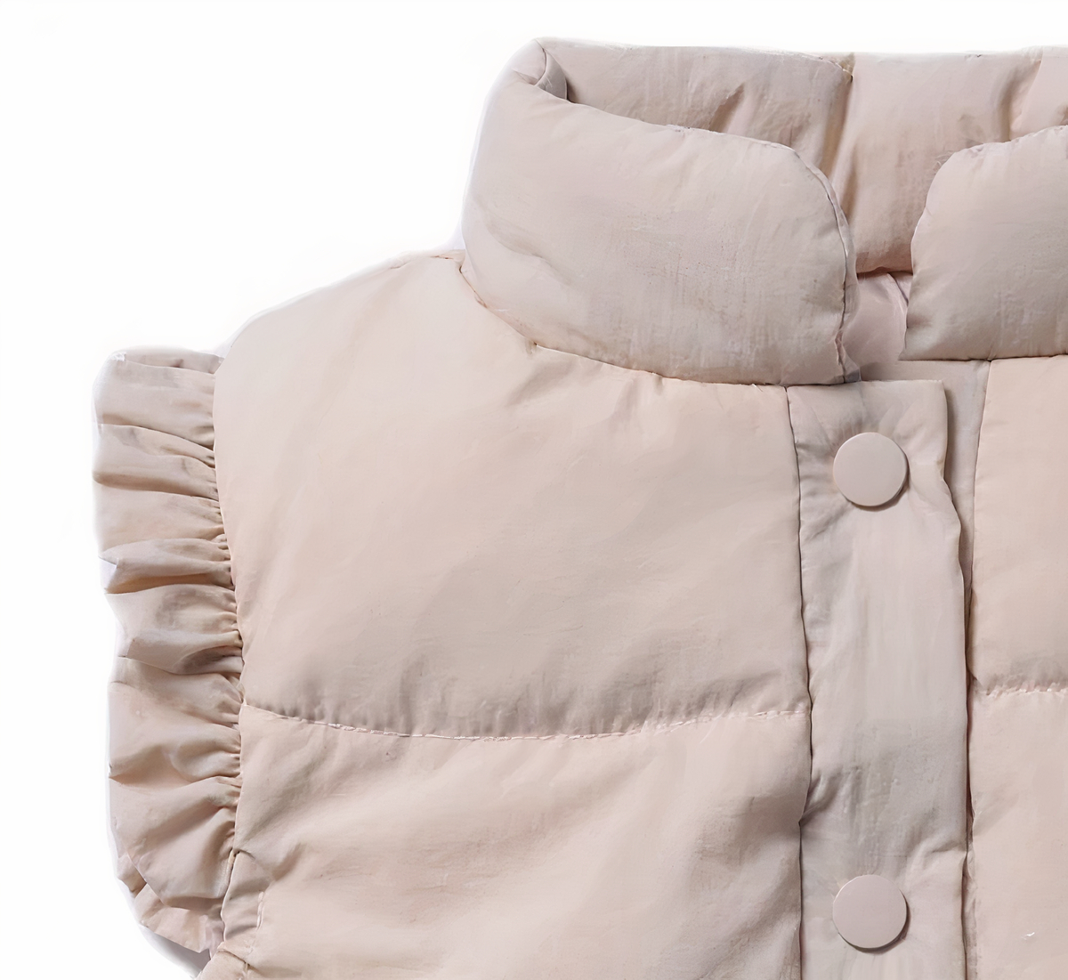 Ons beige mouwloze donsjack voor kleine meisjes is isolerend. Beige is een tijdloze kleur die bij de hele garderobe van uw kind past. Het is warm maar licht en uw dochter kan het overal mee naartoe nemen, omdat het gemakkelijk in een rugzak past.