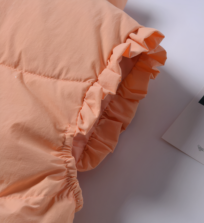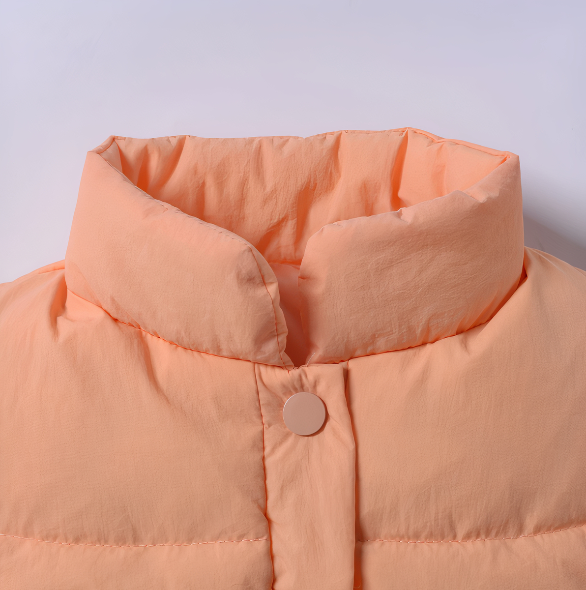 Dit oranje mouwloze donsjack voor kleine meisjes is gemakkelijk aan en uit te trekken dankzij de rij drukknopen aan de voorkant. Het is warm en isolerend, perfect voor koelere dagen. Meisjesachtig en schattig, uw dochter zal er dol op zijn. Verkrijgbaar in verschillende kleuren!